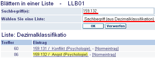 Mit der Nummer - etwa 159 für Psychologie – kann weiter recherchiert werden, um Spezifischeres oder Ähnliches in Unterklassifikationen zu finden, z. B. Angst (159.132) oder Lerntechniken (159.156).